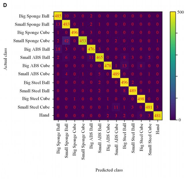 比如说在物体分类识别时,仅使用材料导热率来感知,其识别精度可达 69.6%,但这时的缺点在于不能区分材料相同、而形状和大小不同的物体,如小海绵球和大海绵球。